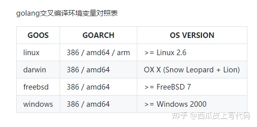 GOOS | GOARCH | OS VERSION ---|---|--- linux | 386 / amd64 / arm | >= Linux 2.6 darwin | 386 / amd64 | OX X (Snow Leopard + Lion) freebsd | 386 / amd64 | >= FreeBSD 7 windows | 386 / amd64 | >= Windows 2000